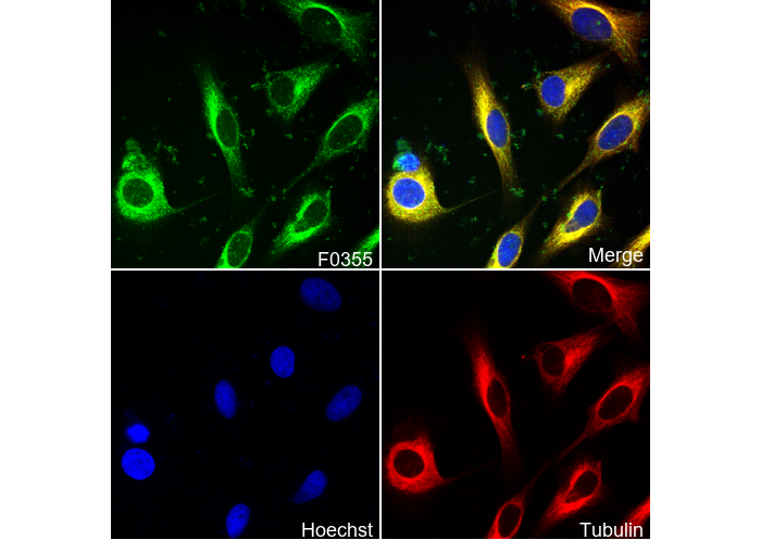 • Immunofluorescent analysis of Hela cells using F0355 (green, 1:400), Hoechst (blue) and tubulin (Red).