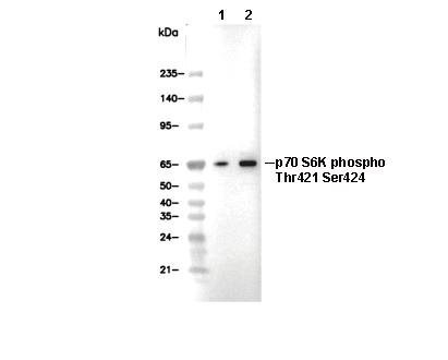 Phospho-p70 S6K (Thr421/Ser424) Antibody [E5J12] 仅识别 Thr421 和 Ser424 处分别被磷酸化的内源性 p70 S6K 激酶蛋白水平。