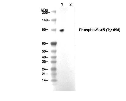 Phospho-Stat5 (Tyr694) Antibody [L6J15] 仅识别 Tyr694 处磷酸化的内源性 Stat5 蛋白水平。