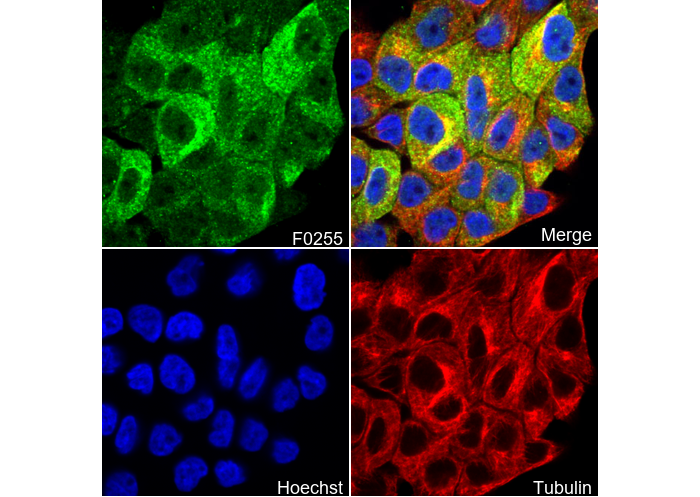 • Immunofluorescent analysis of A431 cells using F0255 (green, 1:50), Hoechst (blue) and tubulin (Red).