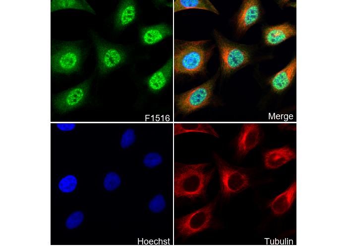 • Immunofluorescent analysis of Hela cells using F1516 (green, 1:200), Hoechst (blue) and tubulin (Red).