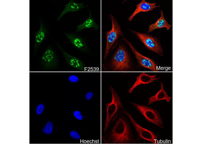 • Immunofluorescent analysis of Hela cells using F2539 (green, 1:500), Hoechst (blue) and tubulin (Red).