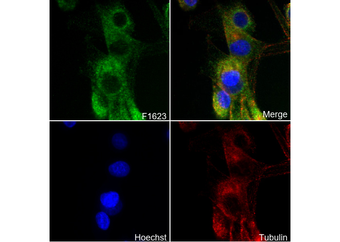 • Immunofluorescent analysis of U87-MG cells using F1623 (green, 1:300), Hoechst (blue) and tubulin (Red).