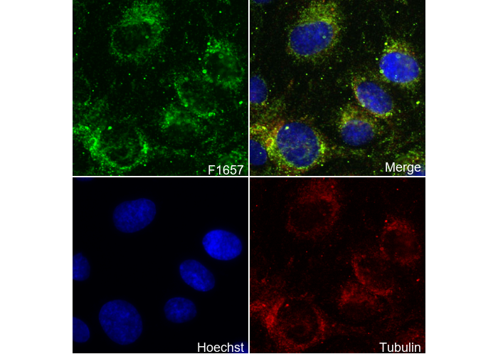 • Immunofluorescent analysis of HUVEC cells using F1657 (green, 1:1000), Hoechst (blue) and tubulin (Red).