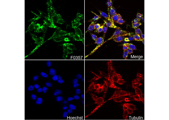 • Immunofluorescent analysis of RAW264.7 cells using F0357 (green, 1:50), Hoechst (blue) and tubulin (Red).