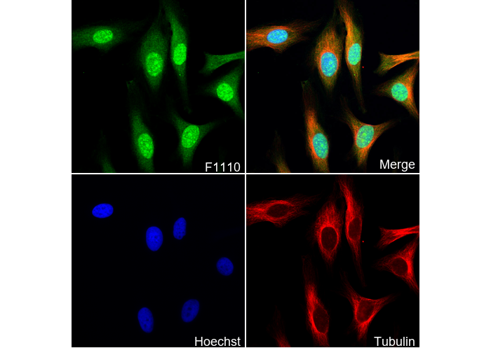 • Immunofluorescent analysis of Hela cells using F1110 (green, 1:250), Hoechst (blue) and tubulin (Red).