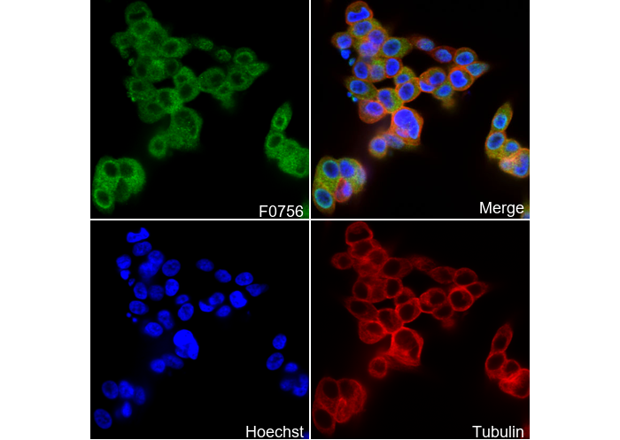• Immunofluorescent analysis of TT cells using F0756 (green, 1:100), Hoechst (blue) and tubulin (Red).