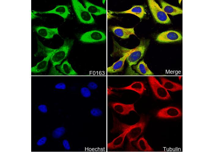 • Immunofluorescent analysis of Hela cells using F0163 (green, 1:100), Hoechst (blue) and tubulin (Red).