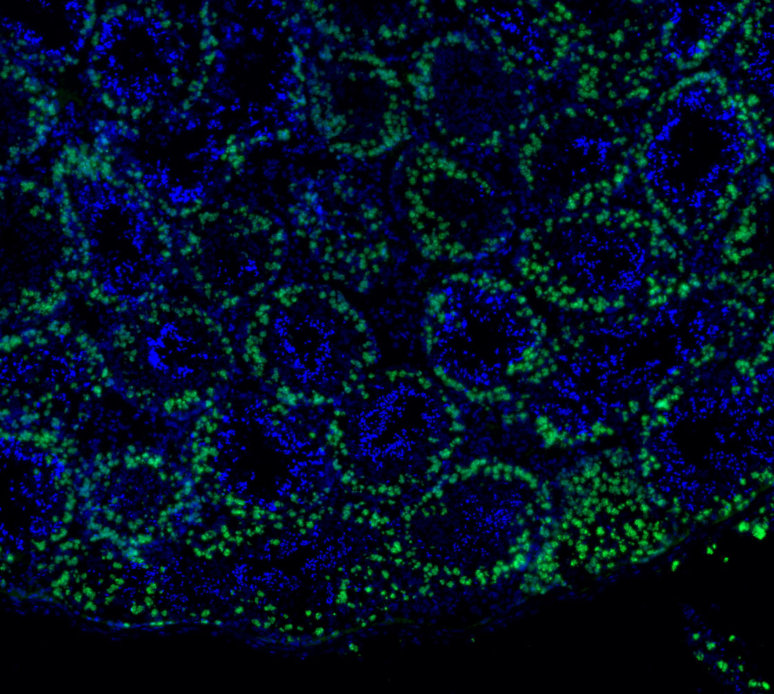 • Immunofluorescent analysis of mouse testis tissue using F1547 (green, 1:4000) and Hoechst (blue).