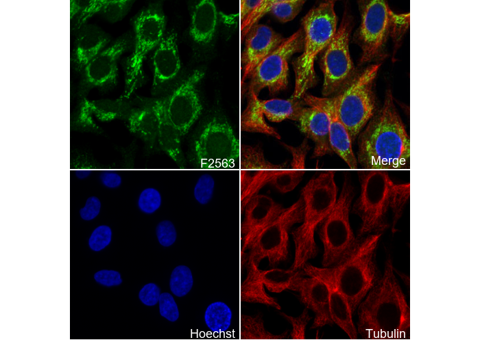 • Immunofluorescent analysis of A549 cells using F2563 (green, 1:200), Hoechst (blue) and tubulin (Red).