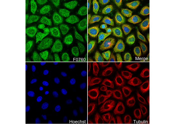 • Immunofluorescent analysis of MCF7 cells using F0760 (green, 1:50), Hoechst (blue) and tubulin (Red).
