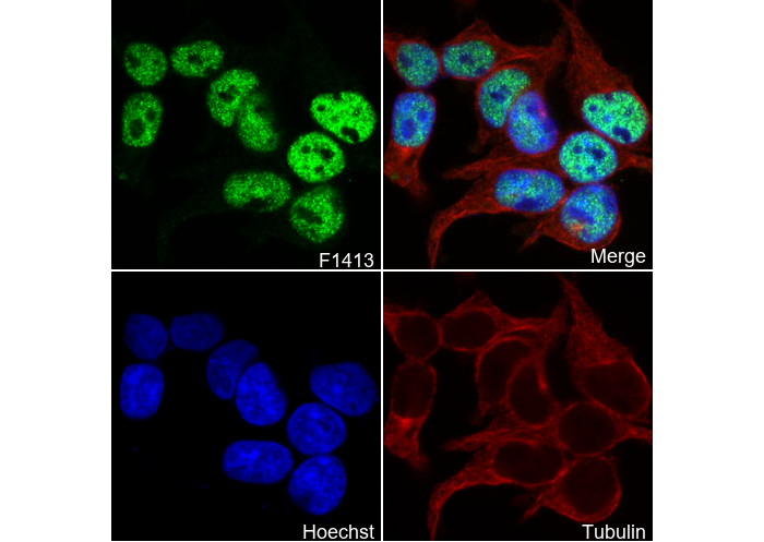 • Immunofluorescent analysis of 293T cells using F1413 (green, 1:200), Hoechst (blue) and tubulin (Red).