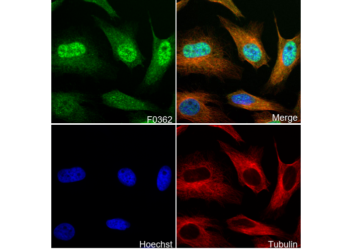 • Immunofluorescent analysis of Hela cells using F0362 (green, 1:200), Hoechst (blue) and tubulin (Red).