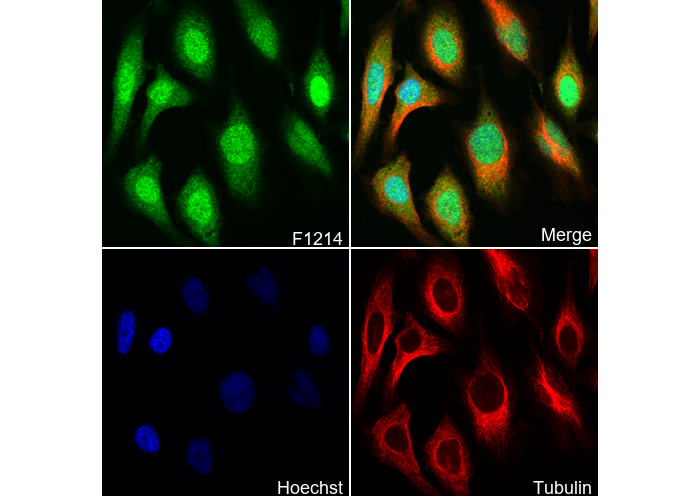 • Immunofluorescent analysis of Hela cells using F1214(green, 1:100), Hoechst (blue) and tubulin (Red).