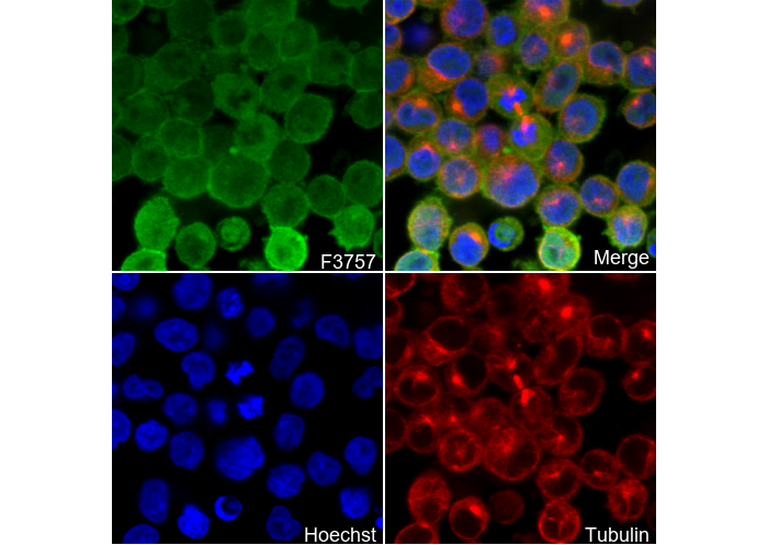 • Immunofluorescent analysis of Raji cells using F3757 (green, 1:250), Hoechst (blue) and tubulin (Red).