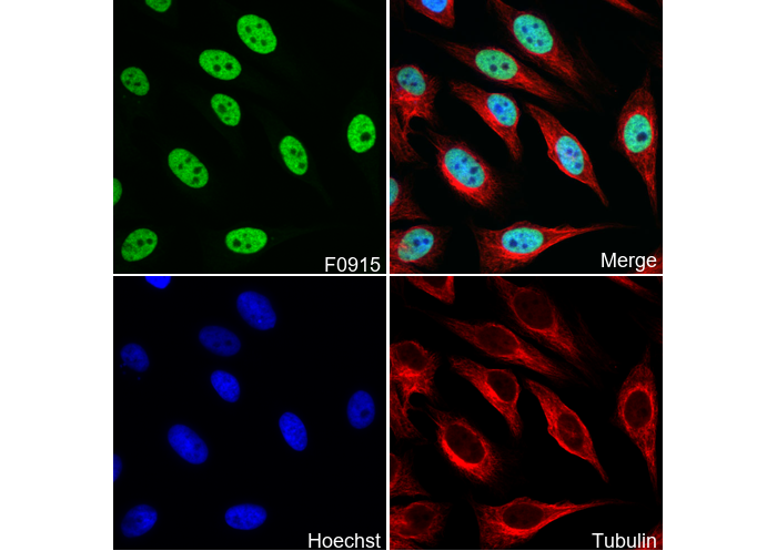 • Immunofluorescent analysis of Hela cells using F0915 (green, 1:50), Hoechst (blue) and tubulin (Red).