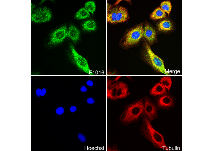 • Immunofluorescent analysis of A549 cells using F1016 (green, 1:50), Hoechst (blue) and tubulin (Red).