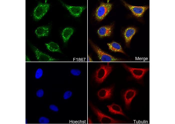 • Immunofluorescent analysis of Hela cells using F1867 (green, 1:200), Hoechst (blue) and tubulin (Red).