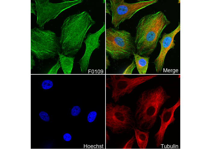 • Immunofluorescent analysis of Hela cells using F0109 (green, 1:100), Hoechst (blue) and tubulin (Red).