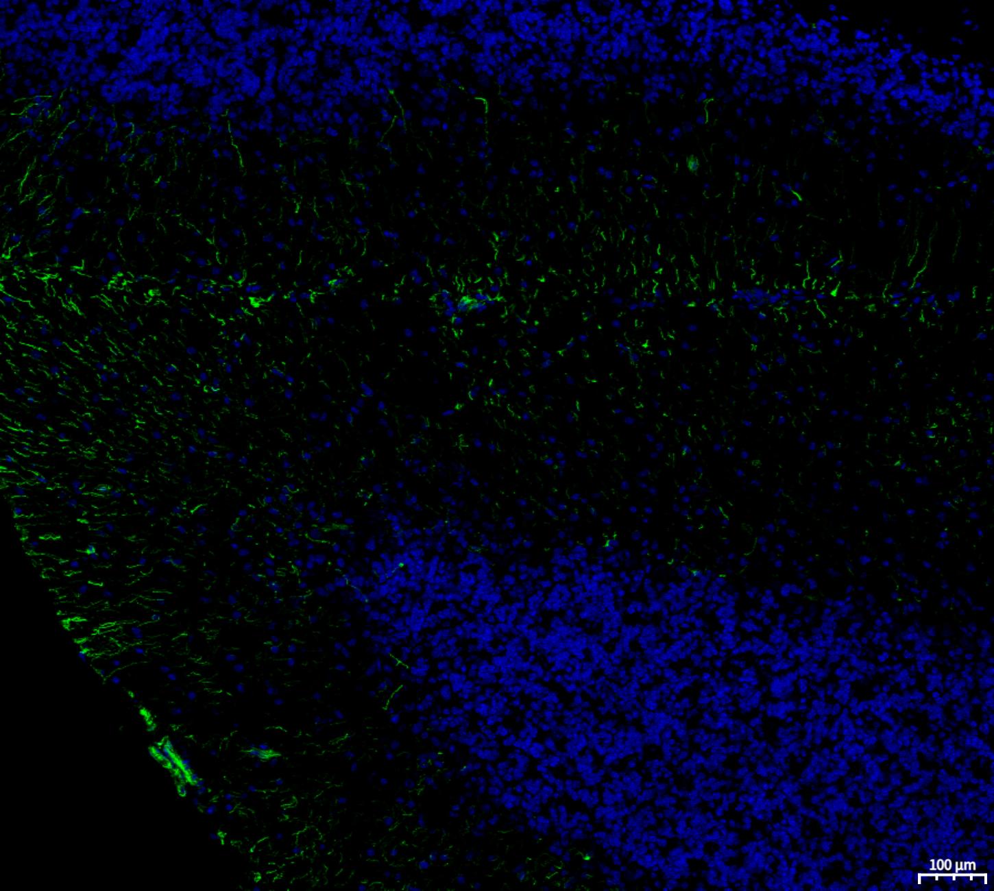 • Immunofluorescent analysis of Mouse cerebellum tissue using F0166 (green, 1:50) and Hoechst (blue).