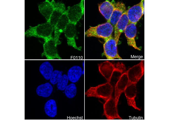 • Immunofluorescent analysis of 293T cells using F0110 (green, 1:50), Hoechst (blue) and tubulin (Red).