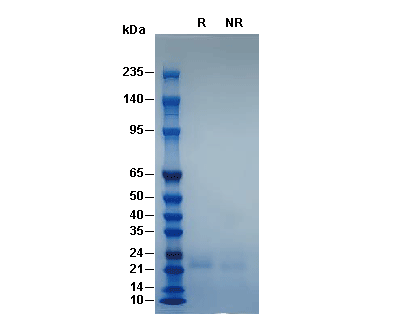 • Recombinant Human IFN-β Protein,CF (HEK293)on SDS-PAGE under reducing (R) and non-reducing (NR) conditions. The gel was stained with Coomassie Blue. The purity of the protein is greater than 95%.