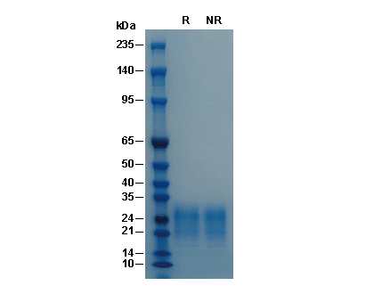 • Recombinant Human IFN-γ Protein (HEK293) on SDS-PAGE under reducing (R) and non-reducing (NR) conditions. The gel was stained with Coomassie Blue. The purity of the protein is greater than 95%.