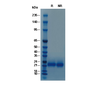 • Recombinant Human IL-6 Protein (HEK293) on SDS-PAGE under reducing (R) and non-reducing (NR) conditions. The gel was stained with Coomassie Blue. The purity of the protein is greater than 95%.