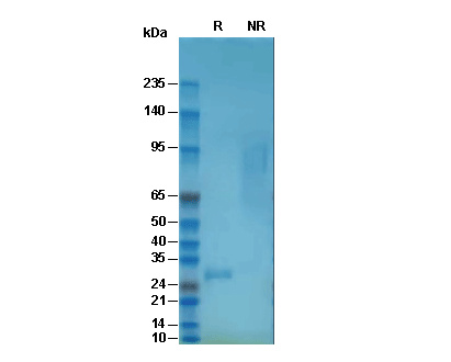 • Recombinant Human Noggin Protein, CF (HEK293)on SDS-PAGE under reducing (R) and non-reducing (NR) conditions. The gel was stained with Coomassie Blue. The purity of the protein is greater than 95%.