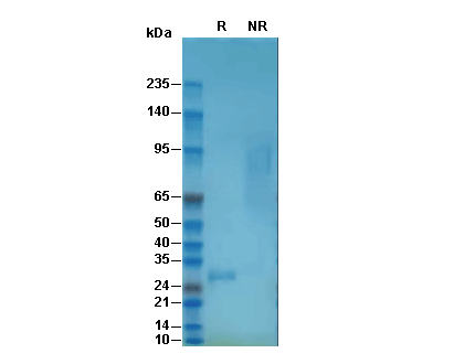 • Recombinant Human Noggin Protein, BSA (HEK293)on SDS-PAGE under reducing (R) and non-reducing (NR) conditions. The gel was stained with Coomassie Blue. The purity of the protein is greater than 95%.