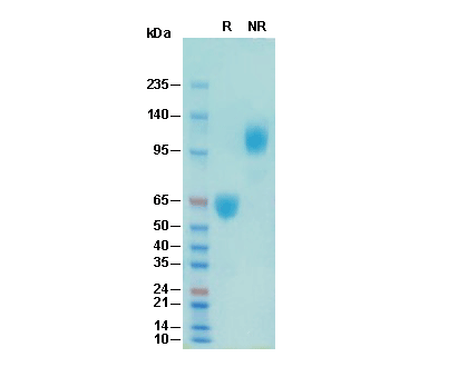 • Recombinant Mouse Ephrin-B2 Fc Protein, CF (HEK293)on SDS-PAGE under reducing (R) and non-reducing (NR) conditions. The gel was stained with Coomassie Blue. The purity of the protein is greater than 95%.