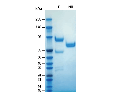 • Recombinant Mouse HGF Protein, BSA (HEK293)on SDS-PAGE under reducing (R) and non-reducing (NR) conditions. The gel was stained with Coomassie Blue. The purity of the protein is greater than 95%.