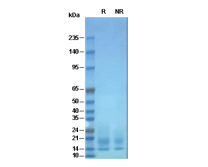 • Recombinant Mouse IL-13 Protein (HEK293)on SDS-PAGE under reducing (R) and non-reducing (NR) conditions. The gel was stained with Coomassie Blue. The purity of the protein is greater than 95%.