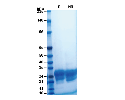 • Recombinant Mouse IL-28A/IFN-lambda 2 protein, BSA (HEK293)on SDS-PAGE under reducing (R) and non-reducing (NR) conditions. The gel was stained with Coomassie Blue. The purity of the protein is greater than 95%.