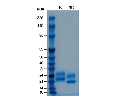 • Recombinant Mouse IL-28B/IFN-lambda 3 protein, CF (HEK293)on SDS-PAGE under reducing (R) and non-reducing (NR) conditions. The gel was stained with Coomassie Blue. The purity of the protein is greater than 95%.
