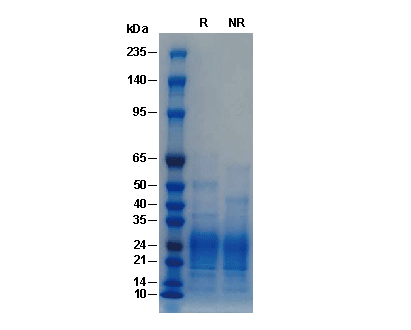 • Recombinant Mouse IL-7 Protein (HEK293) on SDS-PAGE under reducing (R) and non-reducing (NR) conditions. The gel was stained with Coomassie Blue. The purity of the protein is greater than 95%.