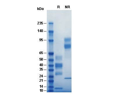 • Recombinant Mouse Noggin Protein, BSA (HEK293)on SDS-PAGE under reducing (R) and non-reducing (NR) conditions. The gel was stained with Coomassie Blue. The purity of the protein is greater than 95%.