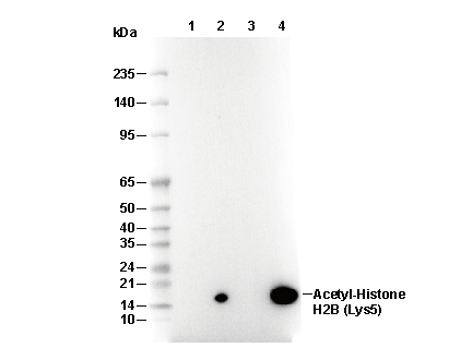 Acetyl-Histone H2B (Lys5) Antibody [B12A5] 仅识别 Lys5 位点乙酰化的内源性 Histone H2B 总蛋白水平。该抗体不与其他乙酰化组蛋白发生交叉反应。