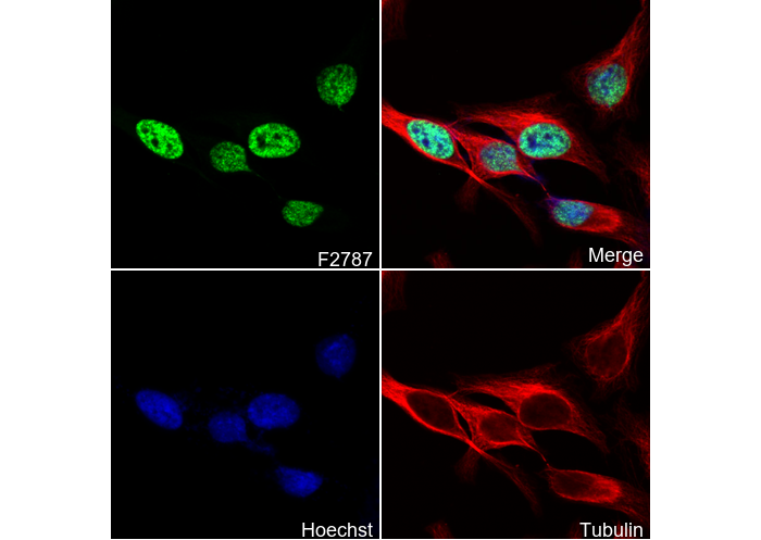 • Immunofluorescent analysis of Hela cells using F2787 (green, 1:1000), Hoechst (blue) and tubulin (Red).