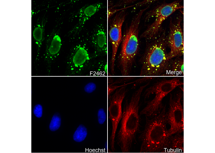 • Immunofluorescent analysis of C6 cells using F2462 (green, 1:150), Hoechst (blue) and tubulin (Red).
