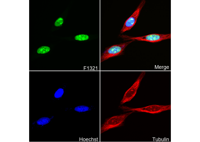 • Immunofluorescent analysis of Hela cells using F1321 (green, 1:800), Hoechst (blue) and tubulin (Red).