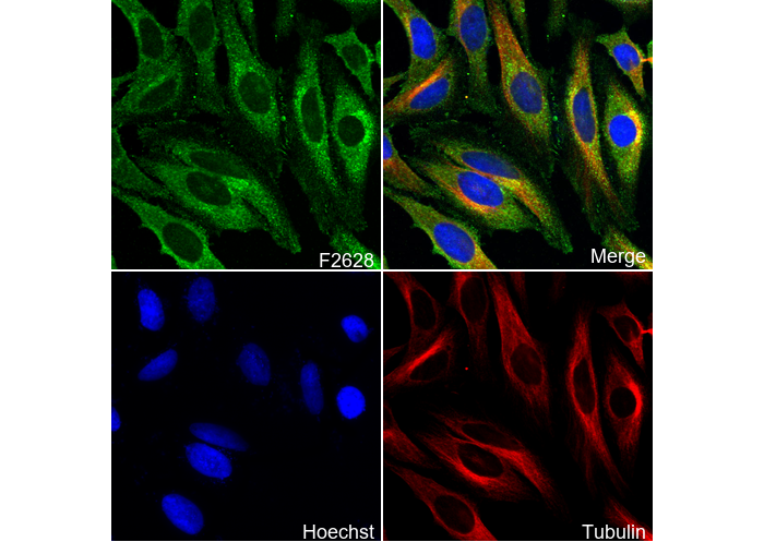 • Immunofluorescent analysis of Hela cells using F2628 (green, 1:100), Hoechst (blue) and tubulin (Red).