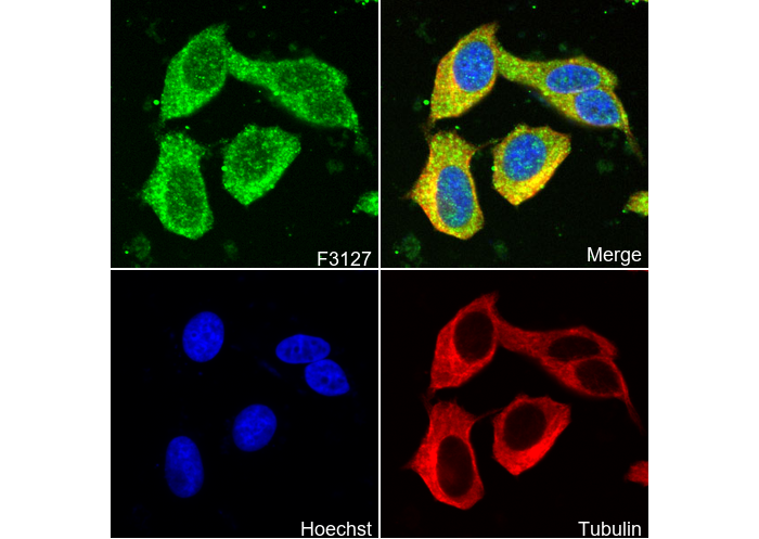 • Immunofluorescent analysis of HepG2 cells using F3127 (green, 1:50), Hoechst (blue) and tubulin (Red).