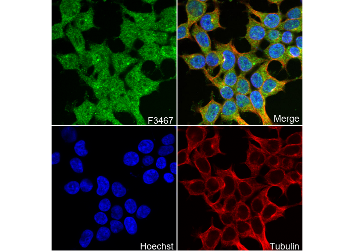 • Immunofluorescent analysis of 293T cells using F3467 (green, 1:250), Hoechst (blue) and tubulin (Red).