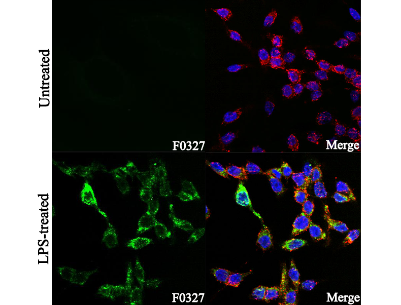 • Immunofluorescent analysis of RAW264.7 cells, untreated (upper) and LPS-treated (1 µg/ml, 24 h)(lower), using F0327(green, 1:800), Hoechst (blue) and tubulin (Red).