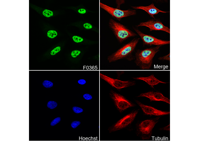 • Immunofluorescent analysis of Hela cells using F0365 (green, 1:200), Hoechst (blue) and tubulin (Red).