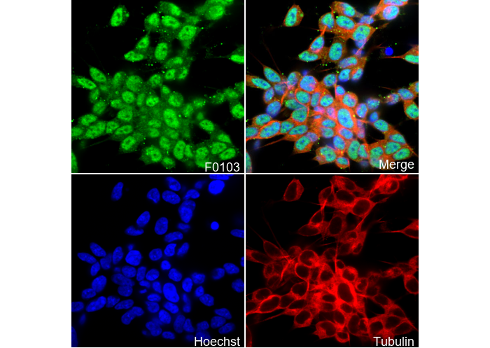 • Immunofluorescent analysis of SH-SY5Y cells using F0103 (green, 1:50), Hoechst (blue) and tubulin (Red).