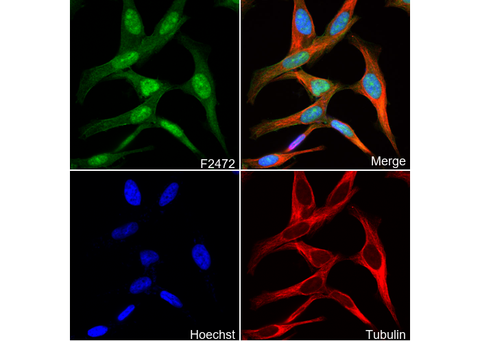 • Immunofluorescent analysis of Hela cells using F2472 (green, 1:100), Hoechst (blue) and tubulin (Red).