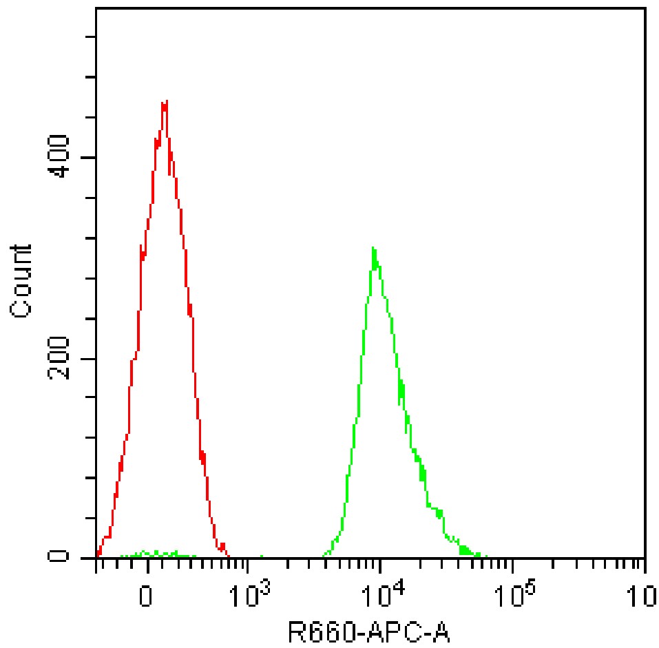 • Staining of RAW264.7 cell line cells using AF647 Mouse uPAR Antibody [MAB531] (Selleck Cat.: G5157) (green, with red blank control). Analyzed data are derived from total cells.