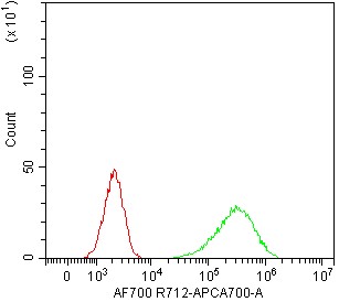 • Staining of HepG2 cell line cells using AF700 Anti-Human CD71 Antibody (Clone: M-A712) (Product No.: H3937) (Green, red is blank cells). Analyzed data are derived from total cells.
